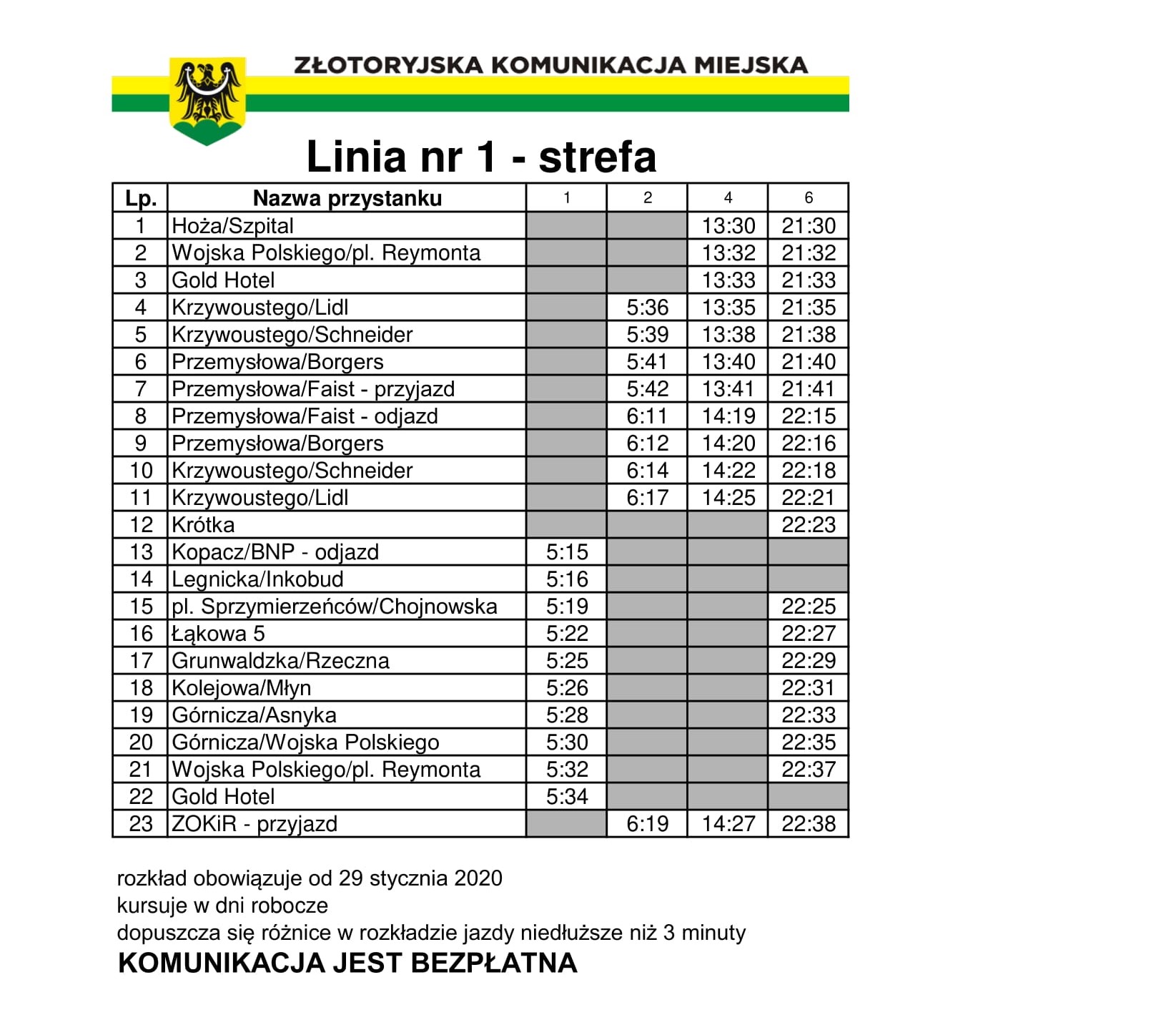 Zmiany obowiązują nie tylko kierowców i pieszych, ale również pasażerów bezpłatnych autobusów miejskich. Modyfikacje w godzinach odjazdów dotyczą każdej z trzech linii i są związane z tymczasowymi rozwiązaniami komunikacyjnymi na przebudowywanym na rondo placu. Przykładowo: część kursów linii nr 1 (tzw. strefowej) będzie się zaczynać na przystanku przy szpitalu, a autobus nie zatrzyma się przed ośrodkiem kultury, tylko na nowym przystanku pod hotelem.